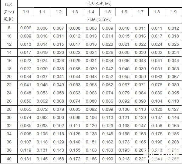 (2)根数为10根、20根、30根……的整十位数的原木、原条、特等锯材和普通锯材的材积累计数,可先相应查出1根、2根、3根……的材积数,然后将小数点右移一位(即扩大10倍)得到。