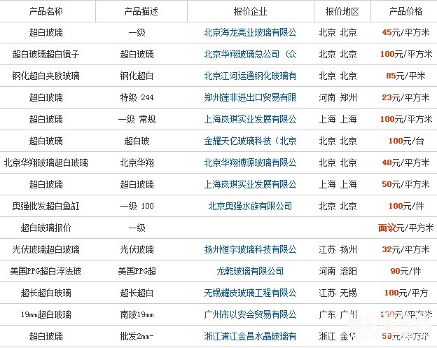 每个地方的超白玻璃价格都是不一样的,存在一定的差异,大家要以当地的为准,此外超白玻璃的价格还与当前的供需状况、运输的远近以及大家的选购数量等有很大关系。小编还搜集了一些超白玻璃厂家对超白玻璃的报价情况,大家可以了解下:
