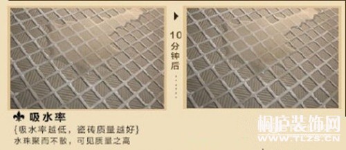 把你带来的矿泉水,倒到瓷砖的正反两面,细心观察水的渗透情况,十几分钟过,如果水还没吸地去,说明你慧眼识砖,挑选到了优质的瓷砖。
