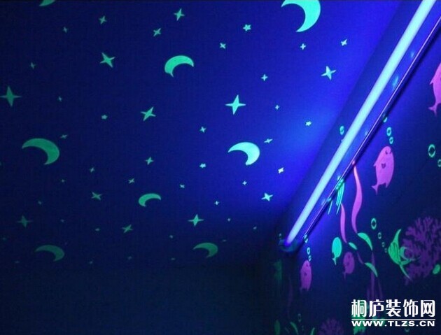 夜光漆是通过特殊的材质,运用吸光发光原理来实现的。一般发光时间为三个小时,白天和普通的壁纸漆实现的效果相同,但在灯光比较暗的情况下会发出泛绿的色彩,比较适用于儿童房间。