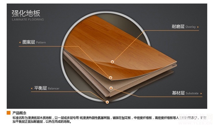 合格的强化地板是以一层或多层专用浸渍热固氨基树脂。覆盖在高密度板等基材表面,背面加平衡防潮层、正面加装饰 层和耐磨层经热压而成。