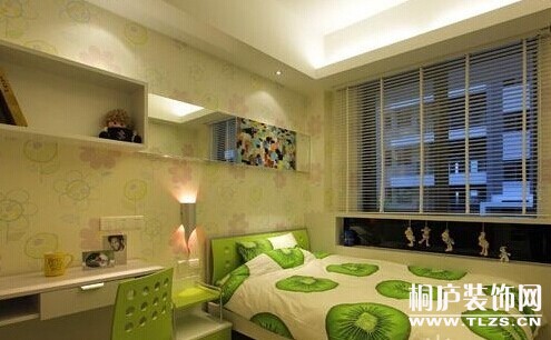 作为儿童房卧室的墙纸,这款富有童趣的墙纸非常适合整个家装设计风格,整个空间以绿色和淡黄色交错相应,墙纸上淡绿色的图案富有天真的童真趣味。