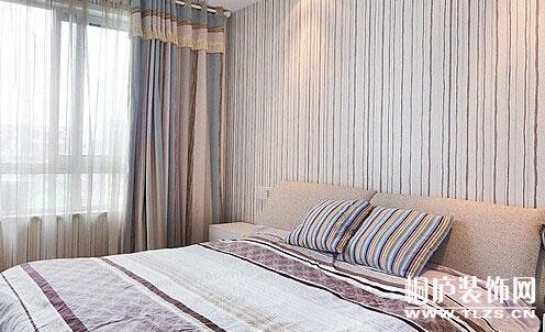 这一款卧室墙纸绝对是条纹控的最爱,不管是床品还是窗帘无一例外的选择了条纹,可见主人是如此喜欢条纹,浅色与深色的交错使整个墙面显得时尚感十足。