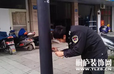 2015年2月26日上午,我局直属三中队执法队员在处理数字城管途中,发现在春江路1233号门前的景观灯灯柱上贴有一张“牛皮癣”。虽然那张“牛皮癣”贴在景观灯靠内侧,十分不显眼,但依然被我局眼明手快的执法队员发现。
