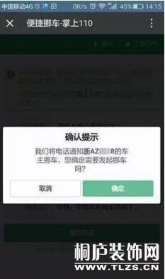 今天开始,桐庐县公安局公众微信号“桐庐公安”向广大市民推出微信“便捷挪车”服务。车主如果发现有车挡了自己的道,只需要关注“桐庐公安”微信公众号。进入自定义菜单,右下角有一项新增菜单“便捷挪车”。点击后,会跳出一个对话框,即进入“便捷挪车”页面,一般只需要输入对方车号牌即可。