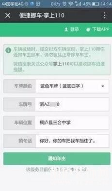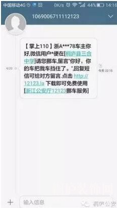 “桐庐公安”微信公众号后台工作人员实测:整个挪车过程,无需下载APP,直接在页面上操作,即可联系到车主,轻松解决挪车难题。一般情况下,你只需要输入6个字母和数字的组合,就可以免费通知到车主来挪车,整个过程不超过10秒钟,而且双方的电话号码都处于保密状态。