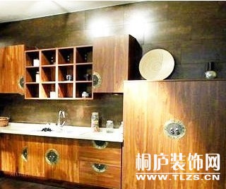 小编点评:这款波克檀香山整体橱柜采用实木门板和瓷砖台面,质感非常好,橱柜的细节处也都很精致。吊柜部分有点像中国的老式橱柜,很有怀旧的感觉。中岛台边上的国画也为整个橱柜增添了亮点。